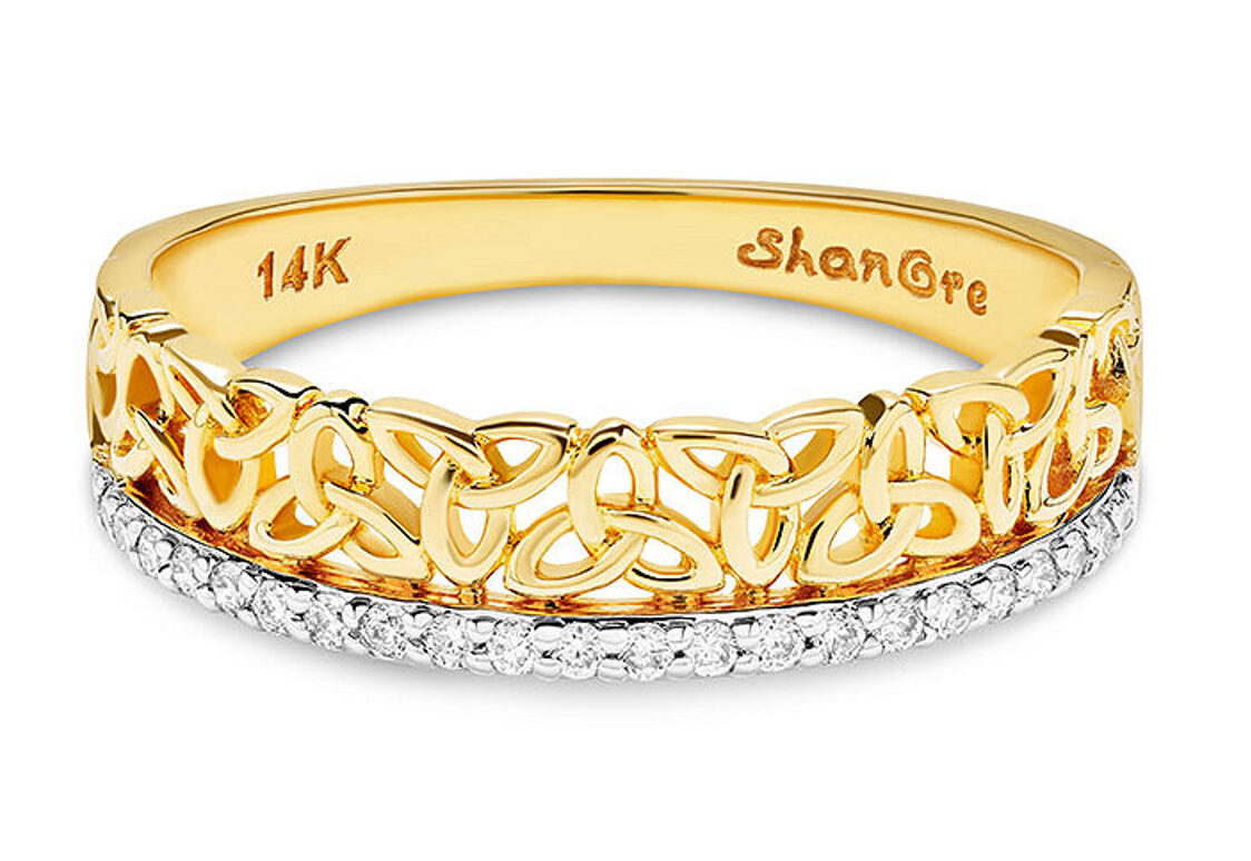 The 14kt Gold Lab Diamond Trinity Ring brings a graceful balance of symbolism and sparkle, featuring an intricate Celtic Trinity knot pattern in glowing 14kt gold and a line of round lab-grown diamonds along the base. The fine openwork design gives it a light, elegant feel, while the diamonds add brilliance and depth without overpowering the detail. Made with eco-friendly, cost-effective lab-grown stones that mirror the look and strength of natural diamonds, this ring is a meaningful and refined choice. A timeless piece filled with history and charm.